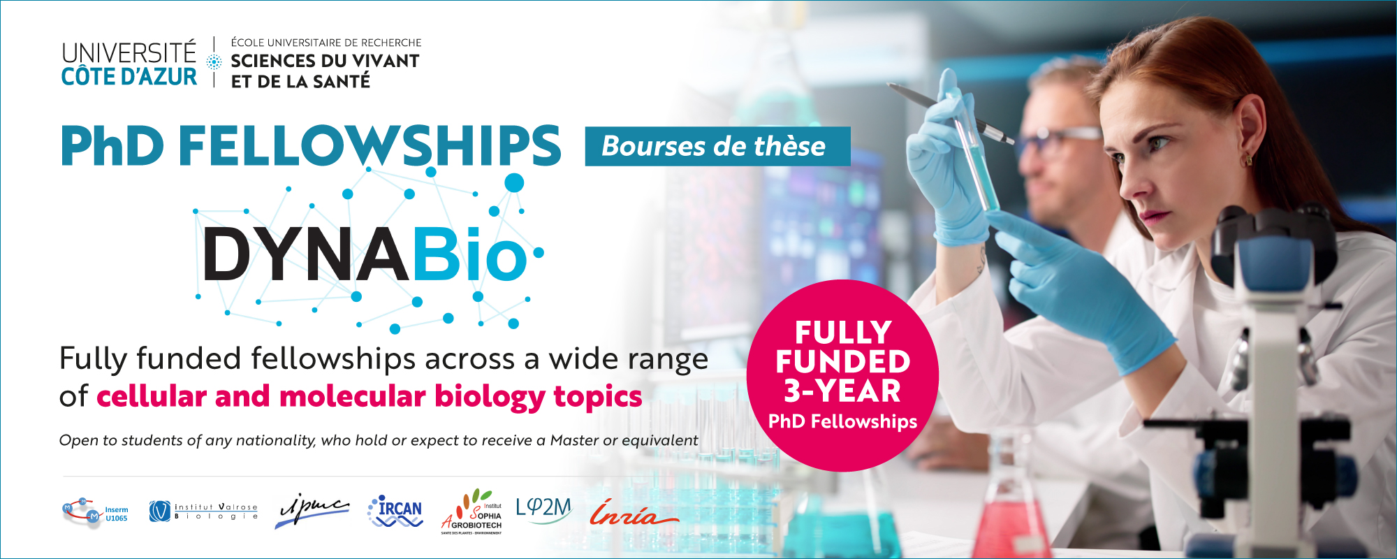 The DYNABio doctoral programme offers fully funded 3-year PhD fellowships across a wide range of cellular and molecular biology topics, within an internationally visible and highly interdisciplinary research environment at Université Côte d’Azur. Université Côte d’Azur is a very dynamic and international University with over 30 000 students; located on the French Riviera in the South of France.