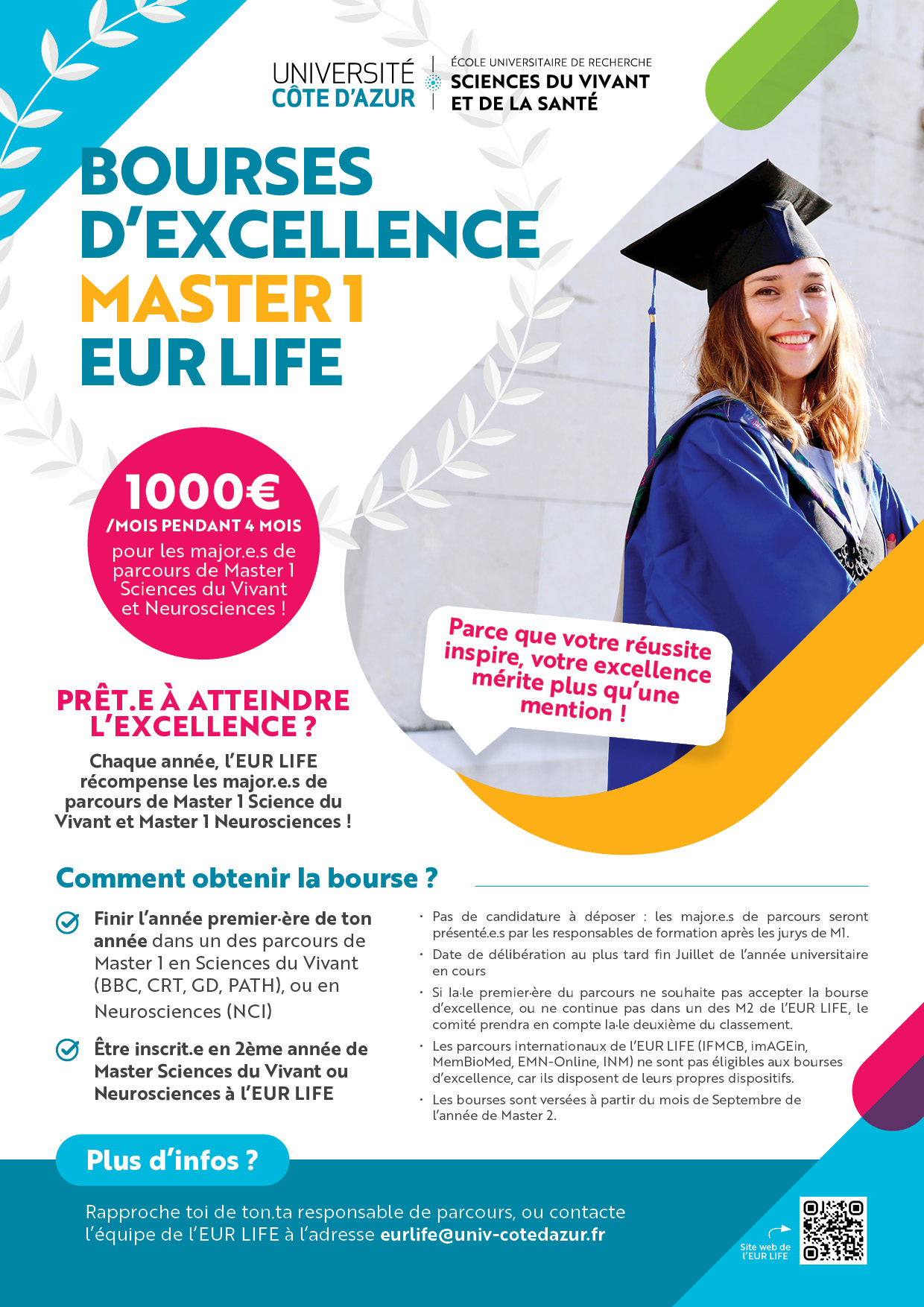 - Les parcours internationaux de l’EUR LIFE (IFMCB, imAGEin, MemBioMed, EMN-Online, INM) ne sont pas éligibles aux bourses d’excellence, car ils disposent de leurs propres dispositifs.